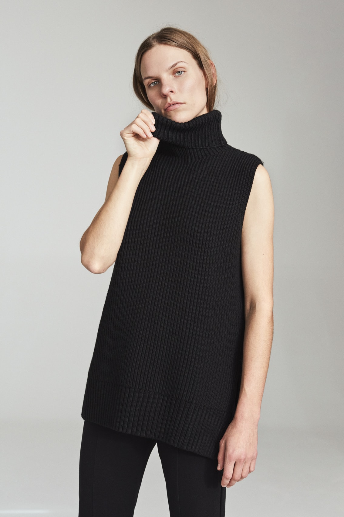 The Carina Top is a sleek top crafted from pure merino wool. With a slightly loose fit and a high turtleneck it makes the perfect piece for layering on colder days. Wear your under a shirt or a blazer, or alone for a chic evening look.