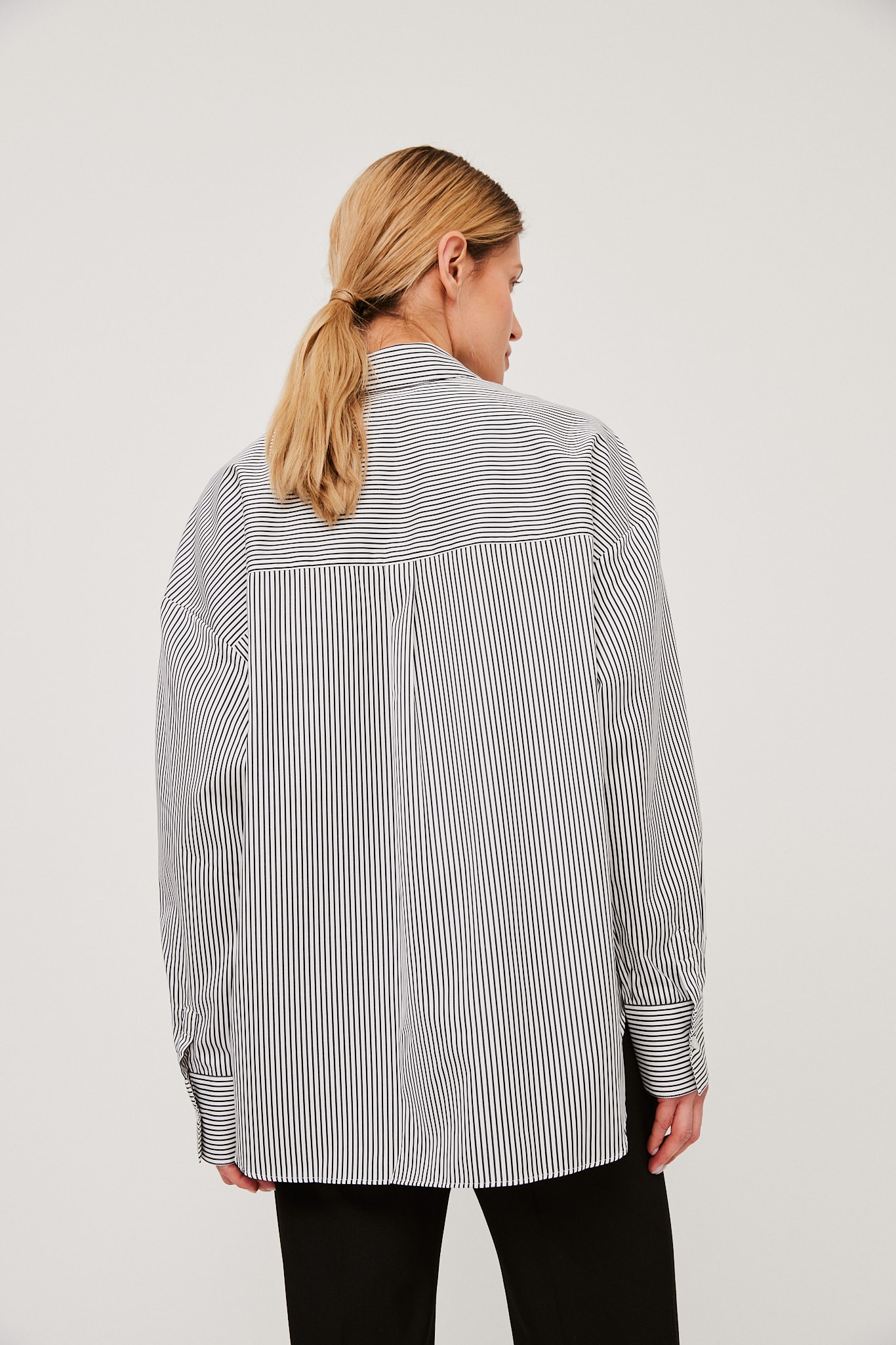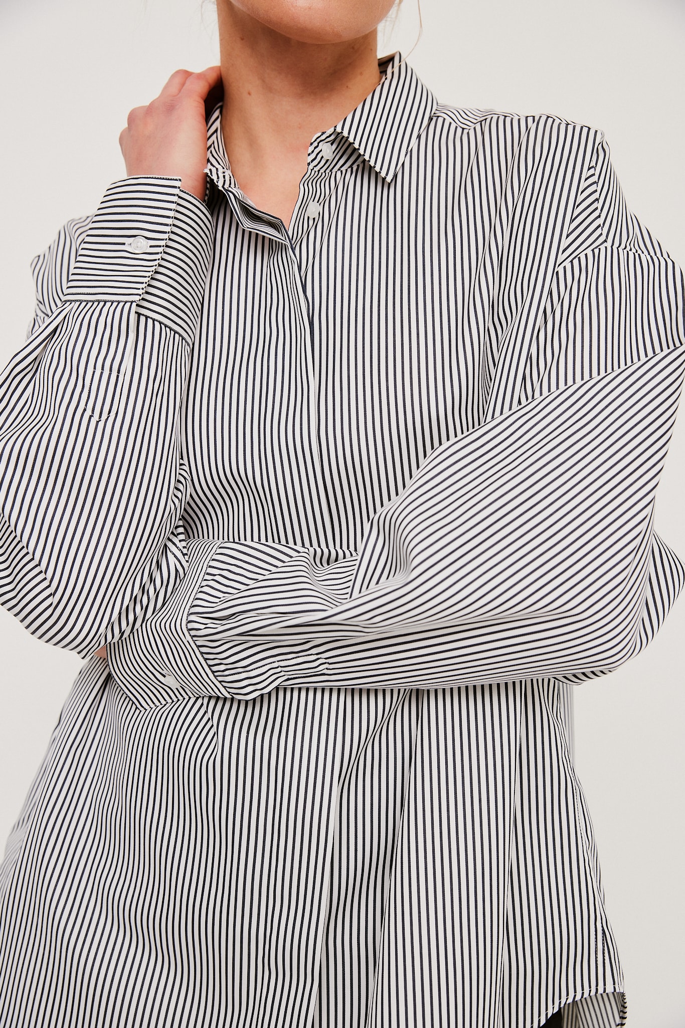 Introducing Frida Dark Navy Stripe – designed for a boxy and slightly relaxed fit. Featuring dropped shoulders and a concealed front placket. Wear yours with a pair of jeans or shorts for the summer.