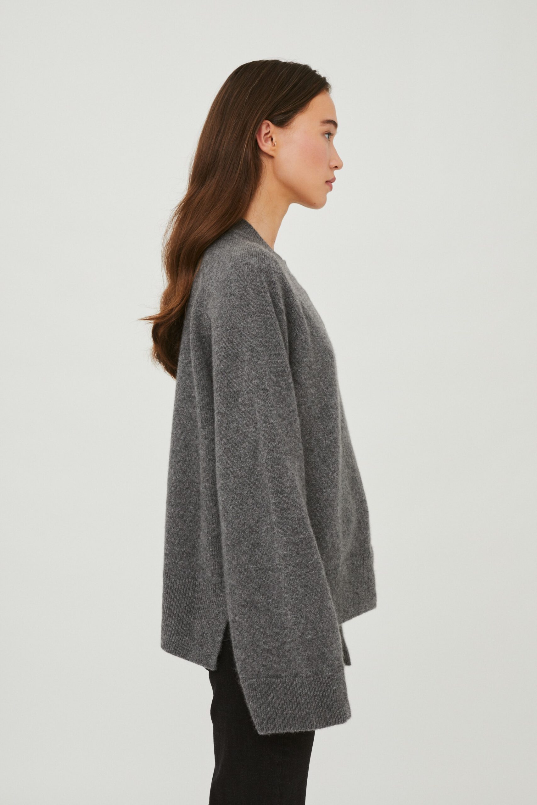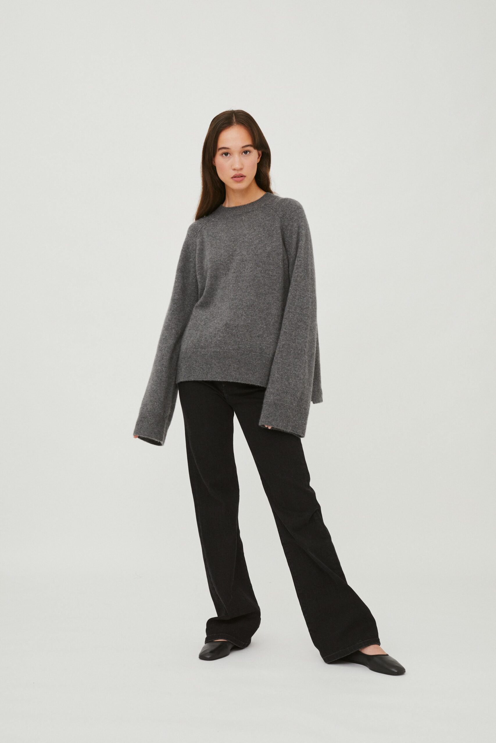 Olivia Cashmere Knit; a soft, A-shaped knit crafted from pure cashmere, featuring ribbed details and side slits. Olivia is the perfect all-season piece; wear over your favourite dress on late summer night, or with Cecilia Satin Trouser for a chic fall look.